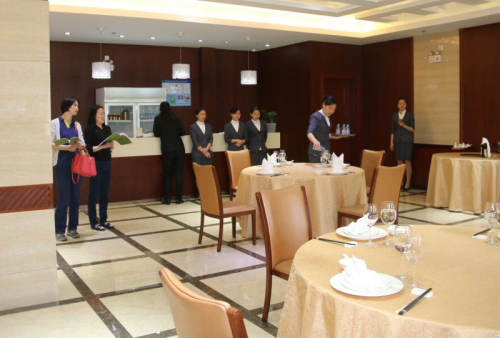为了呈现一场专业的中式摆台比赛,餐饮部的姑娘们可谓下足工夫。从餐具到配套的餐巾、折花的选择要考虑统一协调、相互映衬,从托盘姿势到倒酒的走位再到指引的手势要做到从容平稳、规范有序,从器皿摆放到整体的台面布置要达到松紧有度、美观得体。在此次竞赛中,餐饮部的姑娘们演绎的淋漓尽致、精准到位。