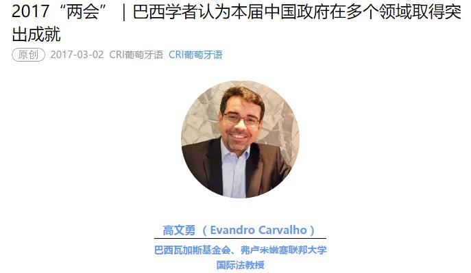 2017年“两会”召开前,德赢官网高端外专Evandro Menezes de Carvalho(中文名:高文勇)接受了国际在线(CRI Online)及新华网的专访。