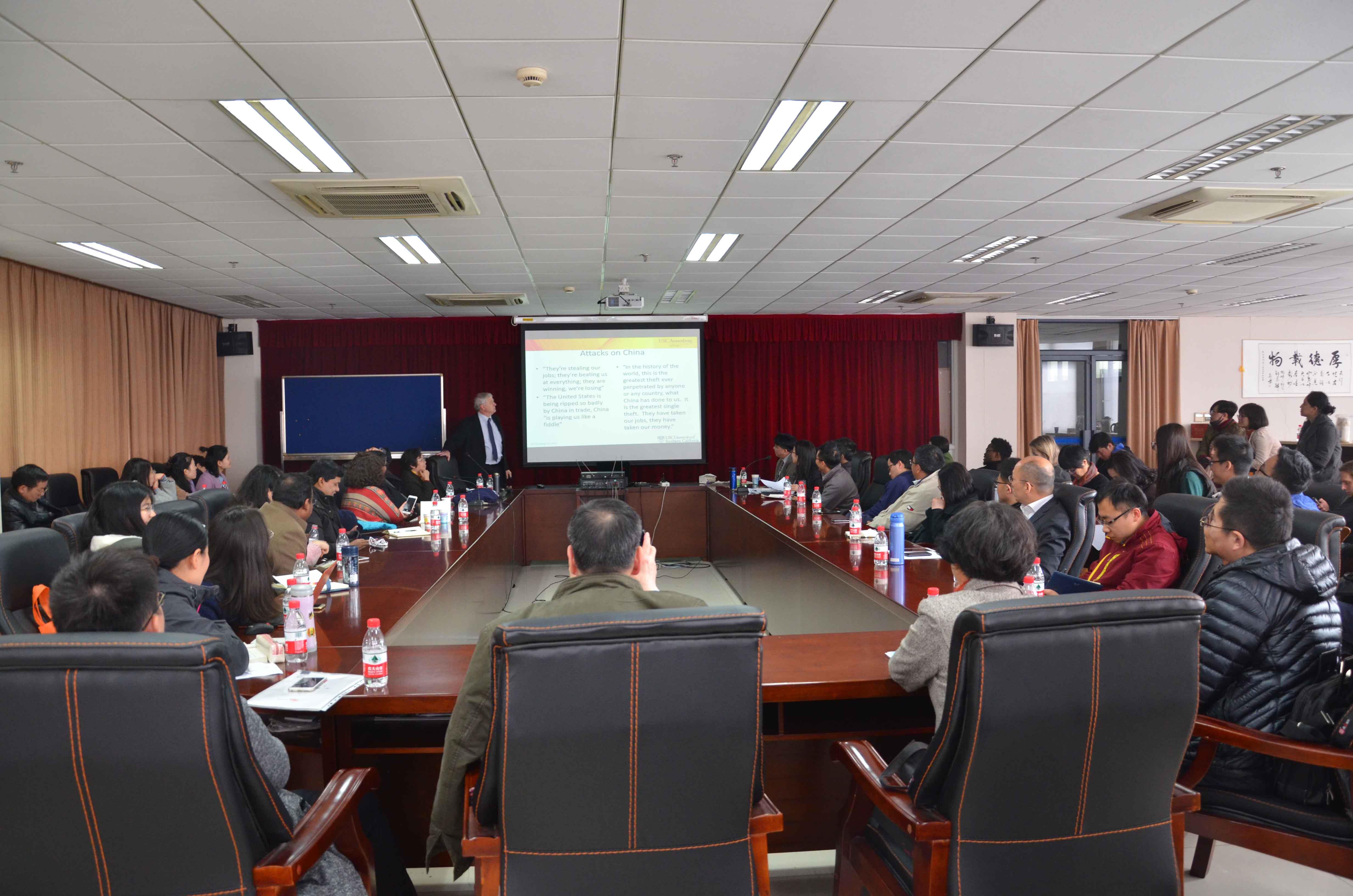 Tom·Hollihan教授首先从美国现任总统唐纳德·特朗普的商人身份、身世经历谈起,介绍了特朗普上台以来的外交政策,尤其是对华政策,以及可能造成两国潜在冲突的几个要素。他认为未来20年是中国发展至关重要的黄金20年,随着中国综合实力的上升,两国关系可能会进入更加脆弱的状态,从更加长远来看,两国要避免“冲突”,共同努力营造稳定发展的良好氛围。王蔚教授则对中美关系持谨慎乐观的态度,他从中美关系的基本特征谈起,认为美国逐渐回归孤立主义,而中国在努力构筑人类命运共同体,机遇与挑战并存,他指出习近平主席关于构建中美新型大国关系的举措是一项前无古人、后启来者的伟大创举,我们要把握内涵,讲究方法,互相尊重,合作共赢。