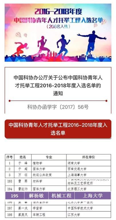 今日,中国科协青年人才托举工程(2016-2018年度)评选工作尘埃落定,名单正式出炉。本次有206名青年科技工作者入选该项工程。机自学院青年教师解杨敏位列其中,是德赢ac米兰官方合作vwin唯一一名入选的青年教师。
