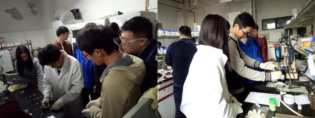 随后,同学们跟从负责此次实验的研究生们走进实验室,正式开始扣式电池的制备实验,实验开始前,学长讲述了主要流程,概括起来就是“剪——压——搅——涂——包”这五步。初次进入如此高端的实验室里,大家都难以按捺心中的激动,在实验室里四处张望。随后同学们在学姐的指导下戴上实验手套,两两结组,开始正式的实验。实验过程非常顺利,其中,两位女生结成的小组因为最后进行压制环节少做了一半实验材料,在等待涂料晾干的男生们纷纷行动,完美地解决了这一问题。最后所有人都包好电池以后,大家又围在一起对电池样品进行测试。看着屏幕上慢慢变化的曲线图,同学们眼中都是难以掩盖的兴奋。
