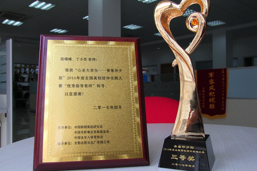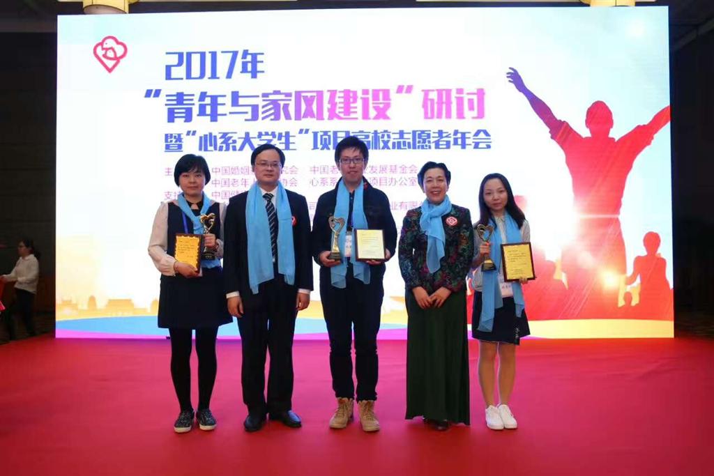 本次活动邀请了中国婚姻家庭研究会、中国青年志愿者协会、中国老龄事业发展基金会、中国健康教育中心、中国老年人体育协会、中国妇女发展基金会、心系系列活动项目办公室等单位相关领导,来自北京、天津、上海、重庆、广州、西安、南京等城市高校团委负责人、大学生志愿者代表、媒体代表以及爱心支持企业京都念慈菴总厂有限公司领导。在德赢ac米兰官方合作vwin团委的支持与指导下,社区学院辅导员马成瑶、陆耀峰参加了本次活动并上台领奖与发言。德赢官网“剪人生”公益团队的项目在前期方案赛中获得了全国三等奖,并在实践赛中与上海新途社区健康促进社合作开展的“执掌手中笔,雕篆岁月痕”孝亲敬老活动也获得了全国实践赛的三等奖,陆耀峰、丁小苜获得“优秀指导教师”称号。