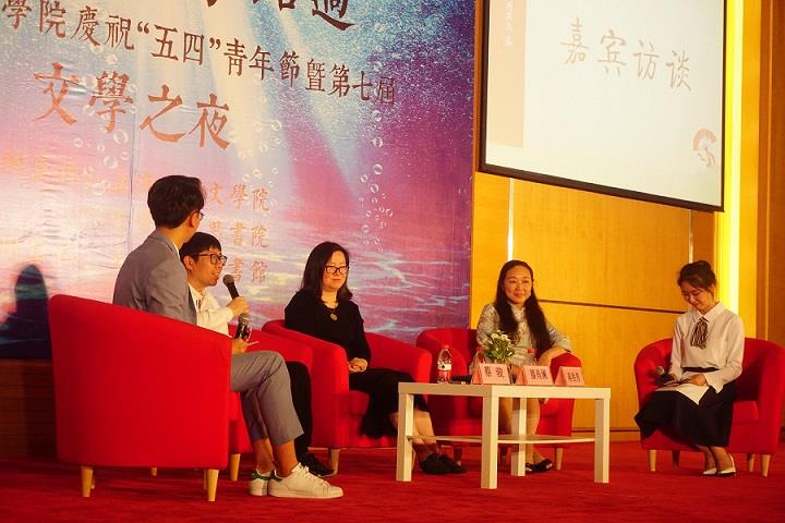 5月4日晚,以“从你的文学路过”为主题的文学院庆祝“五四”青年节暨第七届“文学之夜”在校本部图书馆报告厅隆重举行。“文学之夜”是由德赢ac米兰官方合作vwin文学院主办的大型特色活动,将文学大师请进校园,使师生有机会近距离接近作家,走进文学世界,既陶冶了师生的人文情怀,又丰富了校园文化生活。本届“文学之夜”邀请了著名悬疑小说作家蔡骏、鲁迅文学奖中篇小说奖获得者滕肖澜、《芈月传》作者蒋胜男齐聚一堂,笑谈他们的文学之路。校党委宣传部部长李坚、教务处处长彭章友、校团委书记许烁、校学工办副主任王国建、图书馆直属党总支书记王远弟、图书馆常务副馆长陆铭、文学院党委书记竺剑、文学院党委副书记崔海霞等相关部处及学院领导出席活动。
