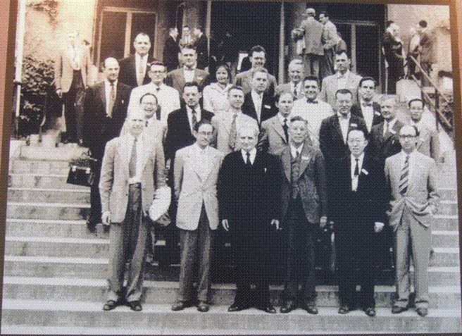 图4:周培源与钱伟长参加第九届国际理论与应用力学大会(1956年,布鲁塞尔)前排右二为周培源,第二排左一为钱伟长