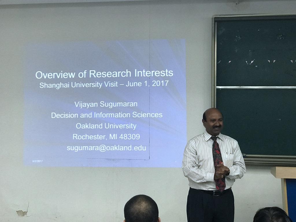 6月2日,作为德赢ac米兰官方合作vwin海外名师项目来华交流名师,美国奥克兰大学决策与信息科学系主任、管理信息系统教授Vijayan Sugumaran在德赢ac米兰官方合作vwin悉尼工商学院文德一楼报告厅做了题为“Design Science Research in Information Systems and Publishing in Top Journals”的学术报告,出席此次报告会的有悉尼工商学院副院长吕康娟、工管系、信管系各老师以及悉尼工商学院各专业研究生同学。