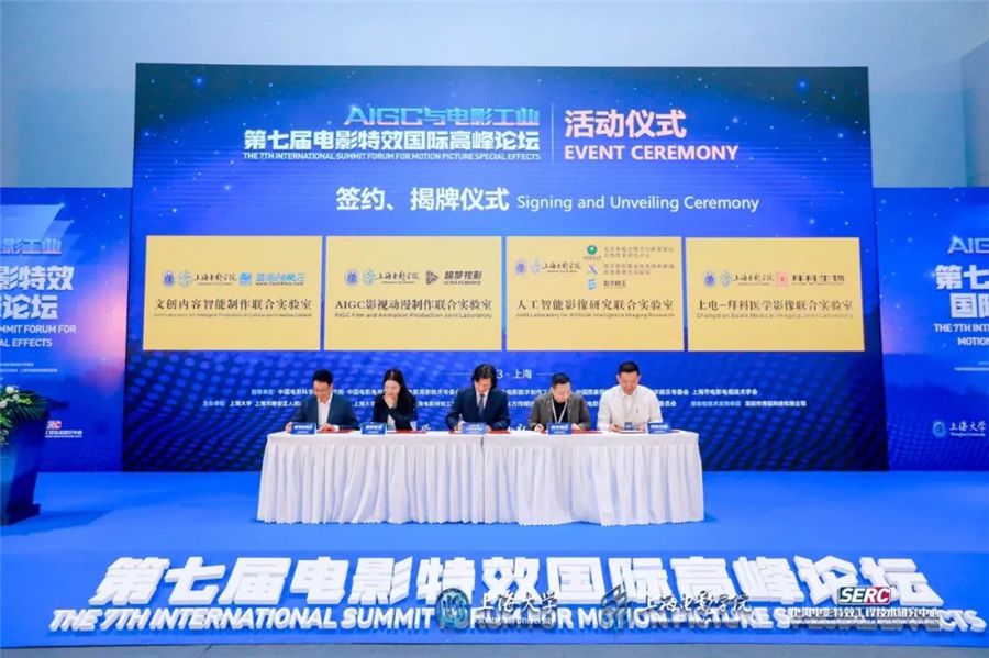 随后,在王从春副校长、陈雨人理事长、刘达总工程师、何小青院长的共同见证下,学院与SMG、蓝海创意云、超梦视影、数字栩生、拜科生物签署了产学研合作协议,并举行联合实验室揭牌仪式。