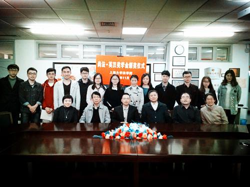 法学院主持工作副院长李凤章教授介绍了尚法▪英汉奖学金的基本情况,并郑重宣布此次奖学金获奖者,一等奖获得者是研究生徐来福、徐丹丹;二等奖获得者研究生孙广阔、牛玲玲,本科生徐伟臣、石晨阳;三等奖获得者研究生曹聪、周美玲、张世冲、姚瑶和本科生戴立、田润。揭英汉为他们颁发奖状,祝贺他们取得这份荣誉,并鼓励他们再接再厉。