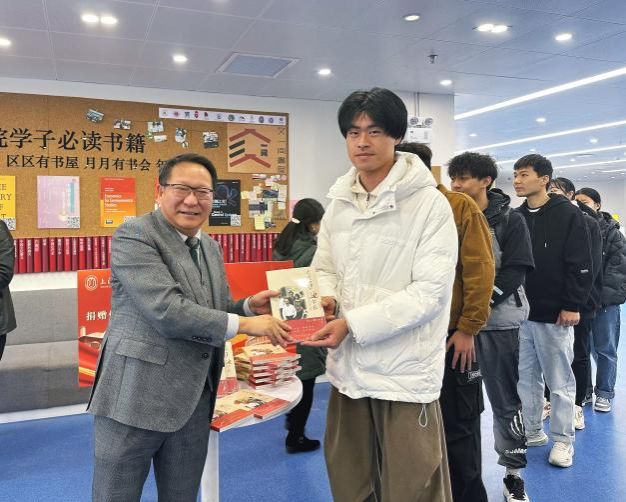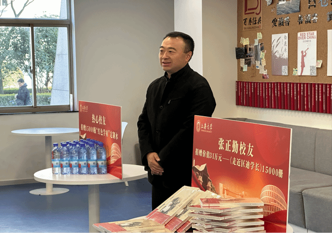 出席捐赠仪式的学生代表接受陈挺、张正勤两位校友的饮用水与《走近匡迪学长》一书。捐赠的饮用水将放置在图书馆24小时学习空间等处供全校师生自取使用;捐赠书籍也将发放给同学们,鼓励大家从书中汲取青春奋进之力量。