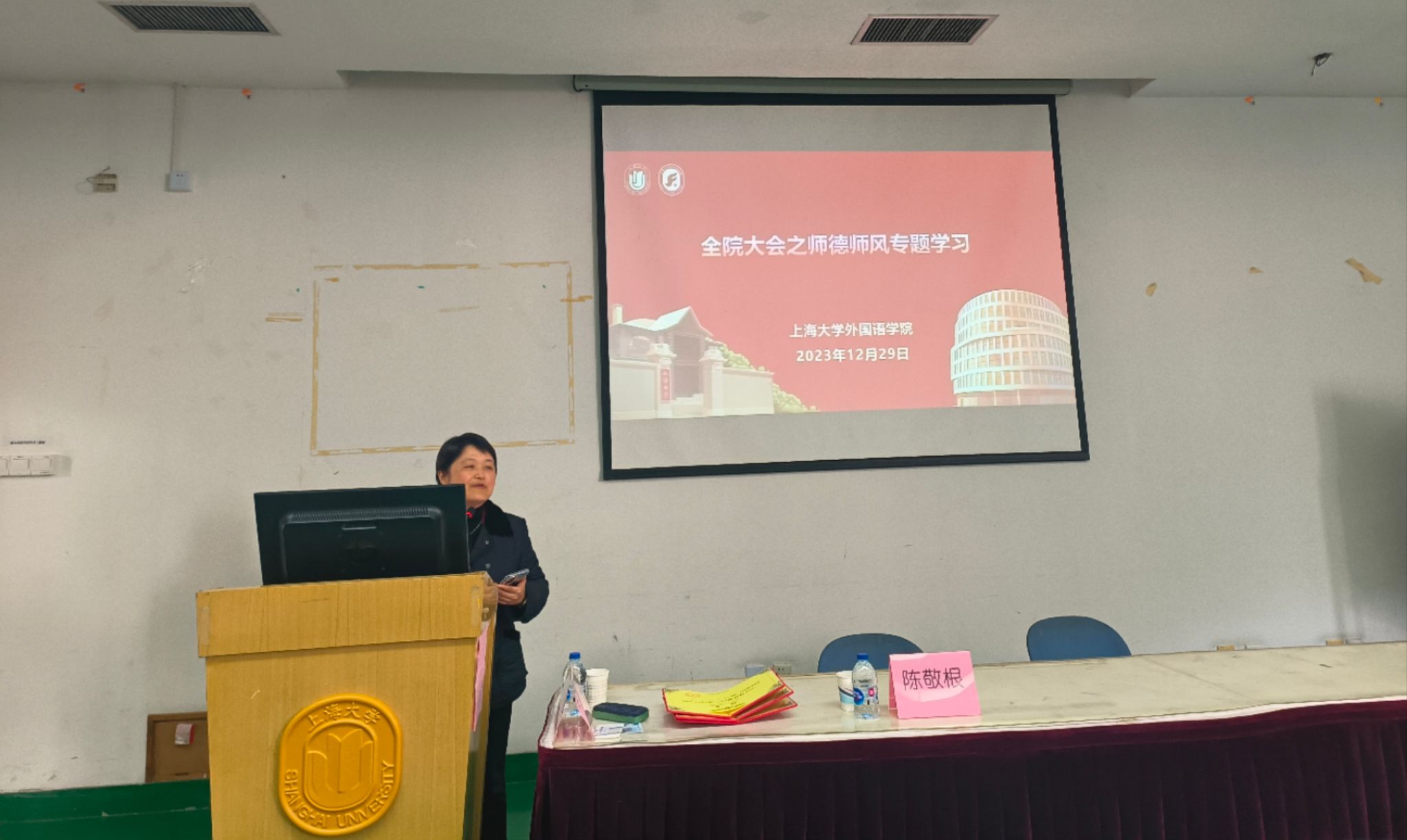 为总结学校近期本科教育教学审核评估工作、加强学院师德师风建设,外国语学院于2023年12月29日下午在宝山校区J101召开了全院大会暨师德师风学习交流会。本次大会邀请德赢ac米兰官方合作vwin党政办公室副主任、法律事务办公室主任陈敬根和德赢ac米兰官方合作vwin心理辅导中心副主任姜艳做专题交流宣讲。大会由外国语学院党委书记吴蔚主持,学院党政领导班子、全体教职工出席本次会议。