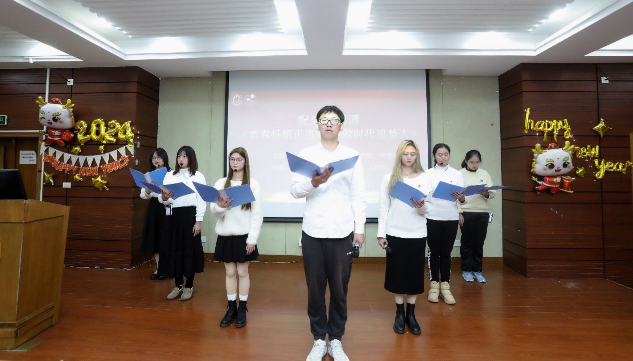 同时学院学生位思雨、周文冉、邓媛媛、曾梦婷等也为大会精心准备了诗朗诵《青春扬帆正当时,争做时代追梦人》、歌曲《如愿》等节目,祝愿学院在新的一年能取得更加优异的成绩。
