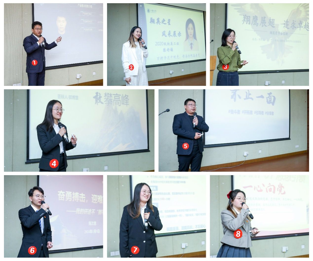 本届“翔英之星”评选自2023年11月启动以来,得到了通信青年的广泛关注与积极参与。经过前期的申报与资料审核,共有八位候选人脱颖而出,分别是本科生组卜宇扬、陈好楠、何雨柔、郭博慧、蒋骏,研究生组陈次恩、洪祎、魏娇。此次评选共分为选手风采展示、专家评审提问、30s拉票互动三个环节。