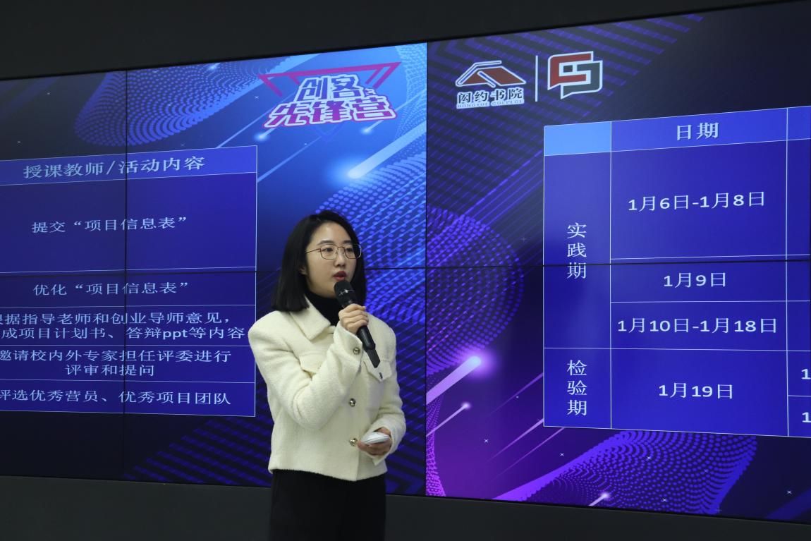 紧接着,德赢ac米兰官方合作vwin新闻传播学院团委副书记朱珈仪介绍了创客先锋营的整体安排。整体划分为三个阶段:培训期、实践期和检验期。在培训期中会邀请到嘉宾对创新创业类赛事进行全面解读,同时邀请一些优秀团队为同学们带来经验分享,在实践期中希望各个团队能够多加交流沟通,在检验期中会邀请专业导师为同学们进行指导完善,希望创客先锋营可以带领同学们走向更好的创新创业之路。