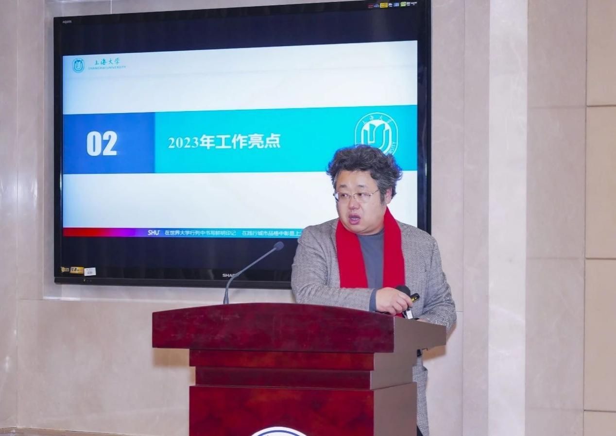随后党委副书记、文学院院长刘旭光进行2023年度工作总结,刘院长分别从2023年关键业绩完成情况、2023年工作亮点、2024年关键业绩指标及目标三个方面进行总结和展望。
