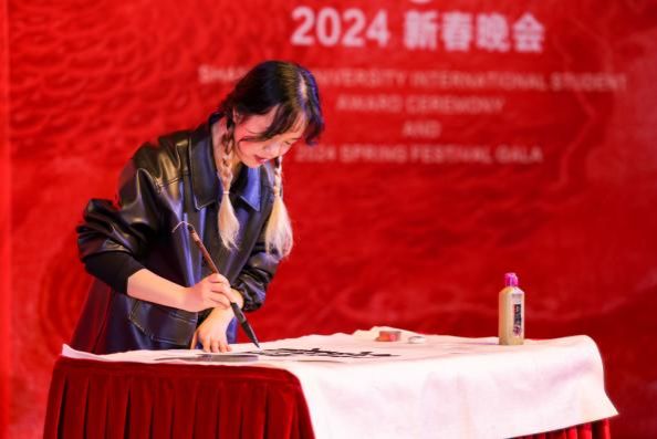 本次活动的主题词为“龙行龘龘 前程朤朤”,为帮助现场观众了解主题词含义,国际教育学院副院长裴雨来教授在汉硕辅导员孙先君老师的配合下为观众现场开展了一节“汉语课”。孙老师现场创作书法,裴老师则在一旁向现场观众讲解“龘(dá)”和“朤(lǎng)”的读音及意义。话毕,孙老师书写的一幅行云流水的“龘”字便展示在观众眼前,两位老师通过现场互动将气氛又一次点燃。“龙行龘龘 前程朤朤”,在崭新到来的龙年,前方的道路将充满光明。
