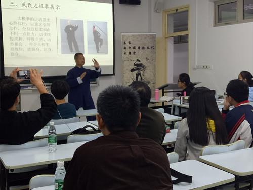 翟世宗先生首先阐述了武氏太极拳的起源、及历代传人的生长背景及对该氏拳法的贡献。根据翟老师的介绍,武氏太极拳是一种起源于清朝咸丰年间的汉族传统拳术,是传统太极拳五大流派之一。该拳由河北省(邯郸)永年人武禹襄所创。据传,武禹襄得王宗岳之《太极拳谱》后,渐得其奥,又经自己多年拳术研习实践,并参以兵家奇正虚实之道、医家经络气血之说、养生家吐纳导引之功、技击家蓄发提放之巧,始创编了流传到现在的“武派”太极拳。该氏拳法后由李亦畲、李启轩在家族内部承袭,而近代武式太极拳在国内多个地方的传播则归功于郝为真的作用。解放后,郝月如、郝少如父子在上海进行了大力推广,武式太极拳逐渐为武术界所了解,特别是1961年人民体育出版社组织出版了太极拳丛书,出版了以郝少如拳架为基础的《武式太极拳》一书,刊载了郝月如、郝少如父子俩的武式太极拳体会文章及郝少如对武式太极拳架的动作要求,这对武式太极拳的推广,特别是体育运动竞赛的武式太极拳武术套路基础都产生了很大的影响。而当代武式太极拳的传承和发展并没有走商业化的道理,仍然保持着较为传统的沿袭方法,突出文武兼修的特点。