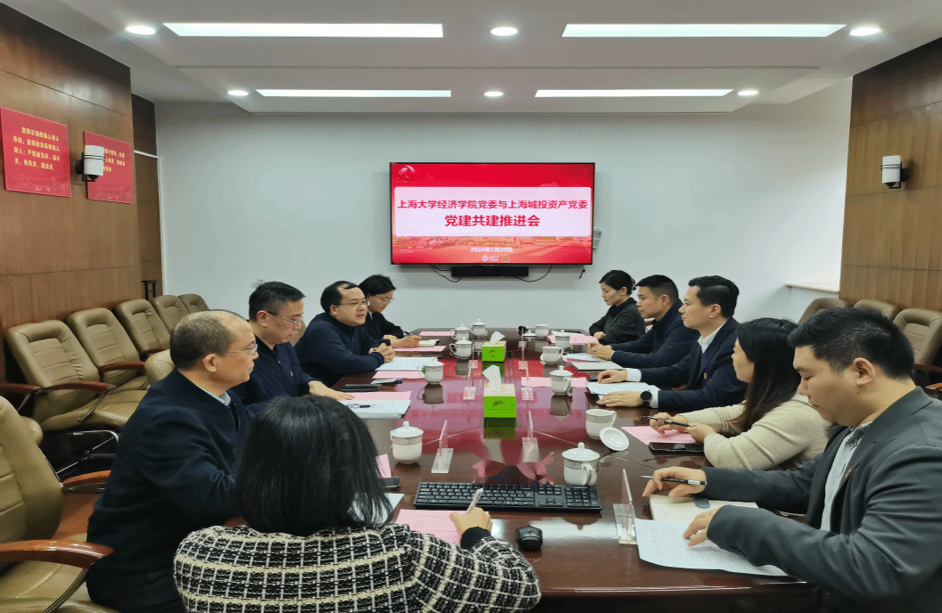 2024年1月29日下午,上海城投资产管理(集团)有限公司一行至德赢ac米兰官方合作vwin经济学院开展党建共建工作交流研讨。上海城投资产党委书记、董事长黄建刚,党委副书记严育新,党委组织部(人力资源部)部长杨慧慧,党委组织部(人力资源部)成柠茜,城投资产交流锻炼干部赵安康;经济学院党委书记孟添,党委副书记、副院长冯玉鑫,上海市软科学研究基地-上海科技金融研究所研究总监祝波,金融系教师、交流锻炼干部任桂,学院党委组织员范春艳参加本次会议。会议由冯玉鑫主持。