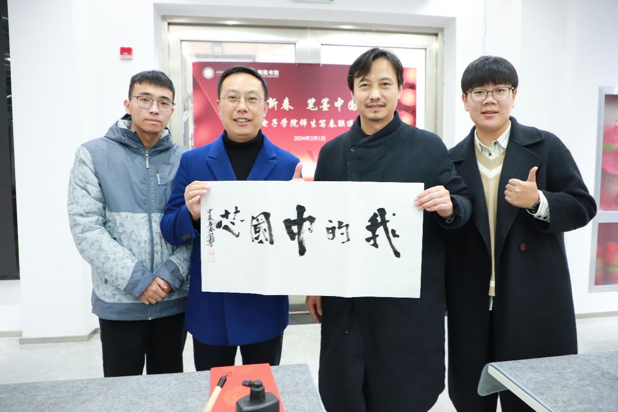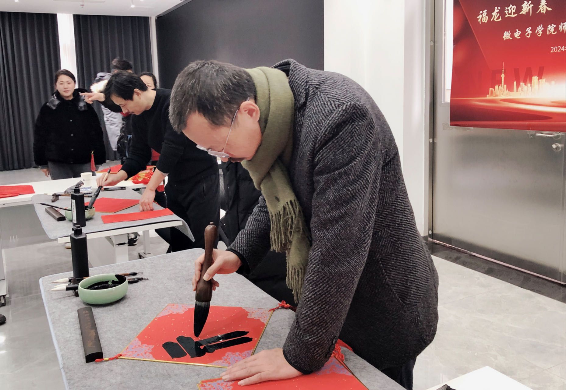 为弘扬中华优秀传统文化,丰富微电子学院师生文化生活,学院工会、青联会于2月1日在学院A楼大厅开展“福龙迎新春,笔墨中国‘芯’”师生写春联送祝福活动。活动邀请了中国美术家协会会员、中国壁画学会会员、上海美术家协会会员、德赢ac米兰官方合作vwin上海电影学院讲师王味之,德赢ac米兰官方合作vwin书画协会会长、德赢ac米兰官方合作vwin上海美术学院教师、书法家钱楷,与学院师生一道挥毫创作出自己心仪的春联、福字。学院党委副书记、副院长、分工会主席袁铭,副院长路秀真以及学院师生、嘉定校区相关老师等参加了活动。