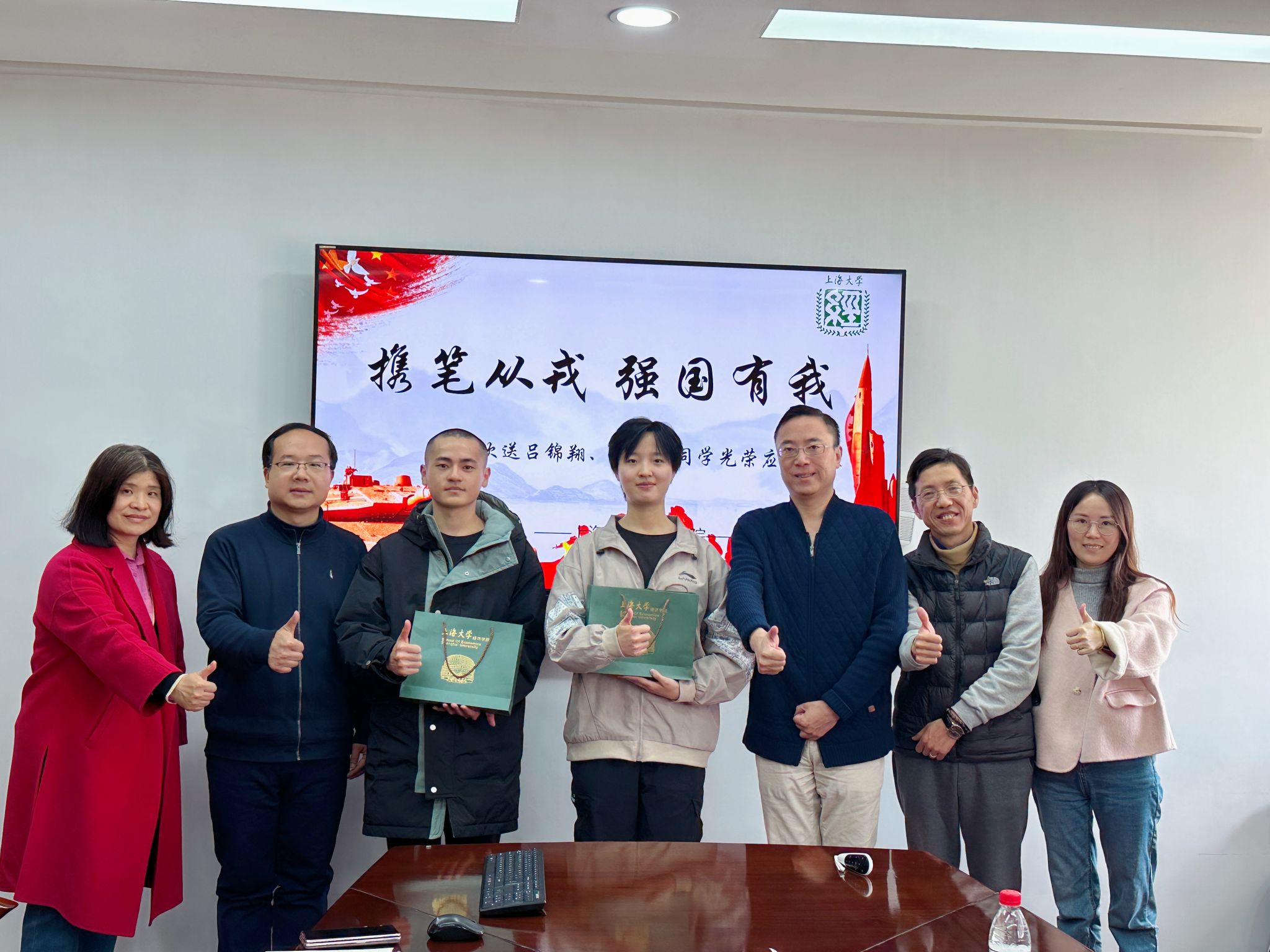 孟添高度赞扬两位同学报效祖国的决心,为同学们能够到部队锻炼倍感骄傲。他希望两位同学能够秉持“自强不息、道济天下”的校训精神,在部队中刻苦训练,努力在保卫祖国的光荣岗位上实现人生价值,在强军兴军征程中书写人生精彩华章。并希望他们发挥爱国荣校精神,退役后将部队精神带回校园。