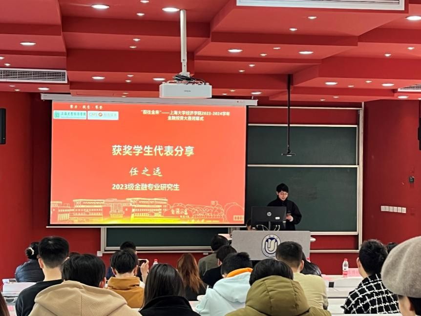 然后获奖学生代表——2023级金融专业研究生任之远分享了自己参赛心得体会。他强调在投资过程中即要坚持自己的判断,不要轻易变更投资策略,也要注意大盘警告讯号,及时做出调整,同时要避免贪心、恐慌等心理,相信运气也要保持理智。