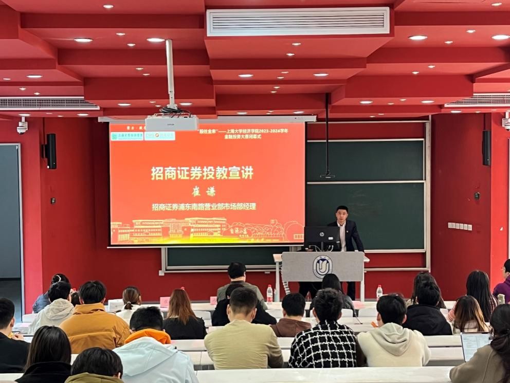 接着,招商证券浦东南路证券营业部市场部经理崔谦进行投教宣讲,崔经理强调了投资全面性和多样性的重要性,鼓励学生在学校期间多加锻炼自己的专业知识和证券交易软件应用能力,增强社交,提高自身的就业竞争力。