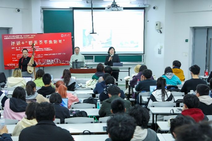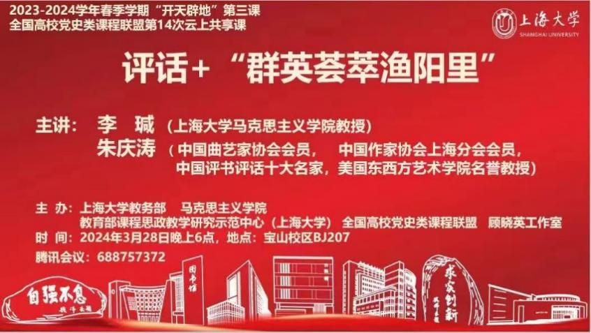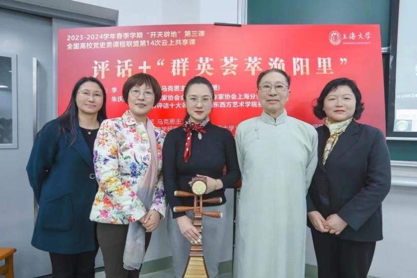 此次课程由德赢ac米兰官方合作vwin教务部、马克思主义学院、教育部课程思政教学研究示范中心(德赢ac米兰官方合作vwin)、全国高校党史类课程联盟、顾晓英工作室共同举办。渔阳里研究专家、德赢ac米兰官方合作vwin马克思主义学院教授李瑊和中国曲艺家协会会员、中国作家协会上海分会会员、中国评书评话十大名家、美国东西方艺术学院名誉教授朱庆涛联袂主讲,琵琶演奏家丁慧老师作为特邀嘉宾。全国高校党史类课程联盟校师生与德赢ac米兰官方合作vwin“开天辟地”课程班学生同步共享了本次精神盛宴。