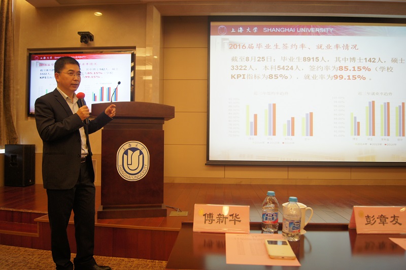 招毕办副主任傅新华首先回顾了2016年就业工作情况。他指出,就业工作关系到国家经济建设和社会稳定,关系到学校长远发展。经济新常态背景下,就业结构性问题突出,德赢官网2016年就业工作在全校师生的共同努力下, 就业率、签约率、生均就业质量、签约世界500强人数等方面均显著提升。接着,他着重介绍了今年学校申报创新创业50强高校、“互联网+”精准就业服务、以“家国情怀”融合职业选择等工作举措。傅新华表示今后就业工作方向将紧密围绕国家、地方重大战略需求以及学校办学定位,加强工作创新,突出内涵建设,促进上大学子高层次、高质量就业。