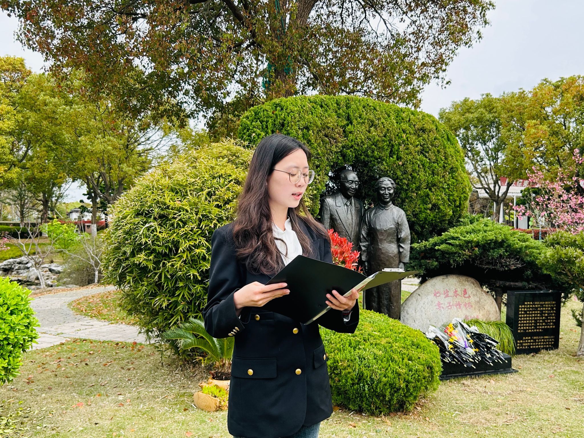 活动伊始,钱伟长学院2024届毕业生路斌贺、杨梦圆同学用白毛巾轻轻地擦拭钱伟长老校长夫妇的铜像和墓碑,并扫去墓碑周边的杂草与枯叶,每一个动作都表达了对钱老夫妇的爱戴与怀念之情。