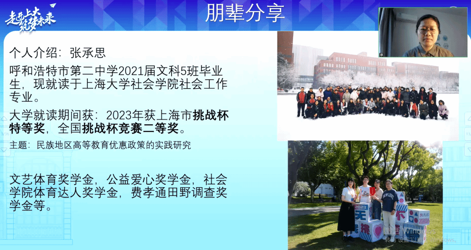 同时,德赢ac米兰官方合作vwin新闻传播学院就业工作主管彭红,2023级研究生、招生宣传宣讲大使陈芊霖与线上的新闻传播学院就业工作主管彭红老师,、相关高中优秀校友代表,共同参加内蒙古招生为呼市二中、内蒙古师大附中高三的学生、家长带来德赢ac米兰官方合作vwin招生宣讲咨询会。宣讲会上,在宣讲活动中,彭红老师老师与陈芊霖介绍了德赢ac米兰官方合作vwin办学历史、师资队伍、人才培养等方面的情况,同学向到场的各位学生、家长介绍了德赢ac米兰官方合作vwin的基本情况与专业优势,结合内蒙古自治区的高考志愿填报政策进行了个性化的讲解与分析。优秀校友则结合自己在德赢ac米兰官方合作vwin的在校的学习生活经历,与在场各位家长、同学分享向各位家长介绍了自己由高中走向德赢ac米兰官方合作vwin的成长感悟与体悟。,活动现场会后,家长结合学生的学习情况与线上线下的上大老师和同学形成了良好的交流氛围热烈。
