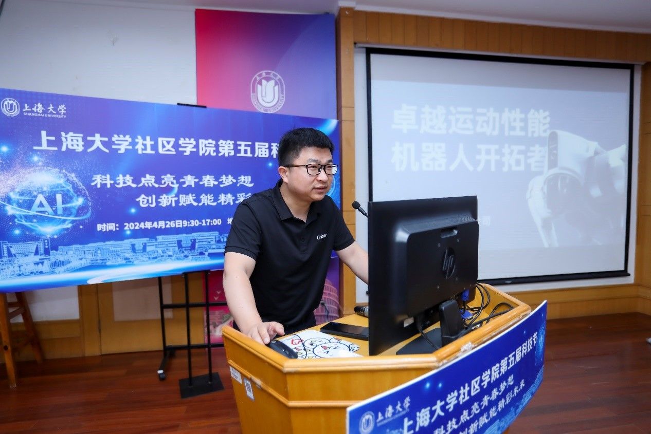在大咖讲座环节,陈立学长为大家带来了“学以致用——通用人形机器人”的主题分享。陈学长结合自身创业经历及研发过程,向同学们详细介绍了足式机器人在生活中各方面的运用及优势,并带来了他们团队所研发的四足机器狗“Go2”与人形足式机器人“H1”。陈学长也在现场鼓励同学们在学好专业课的同时培养自主学习能力,踊跃参与创新创业,争取抓住每一次的科技红利,做新时代的青春领跑人。