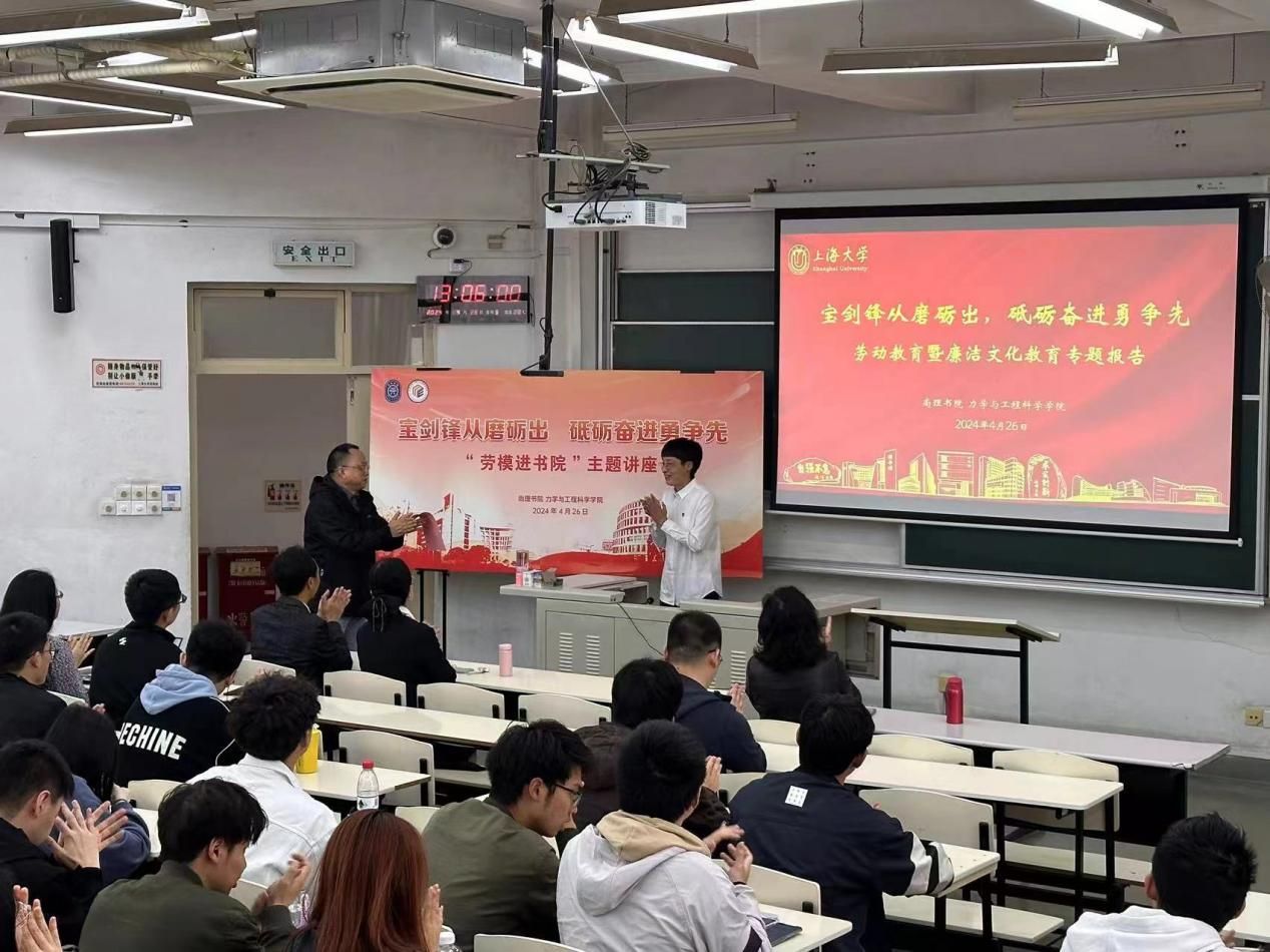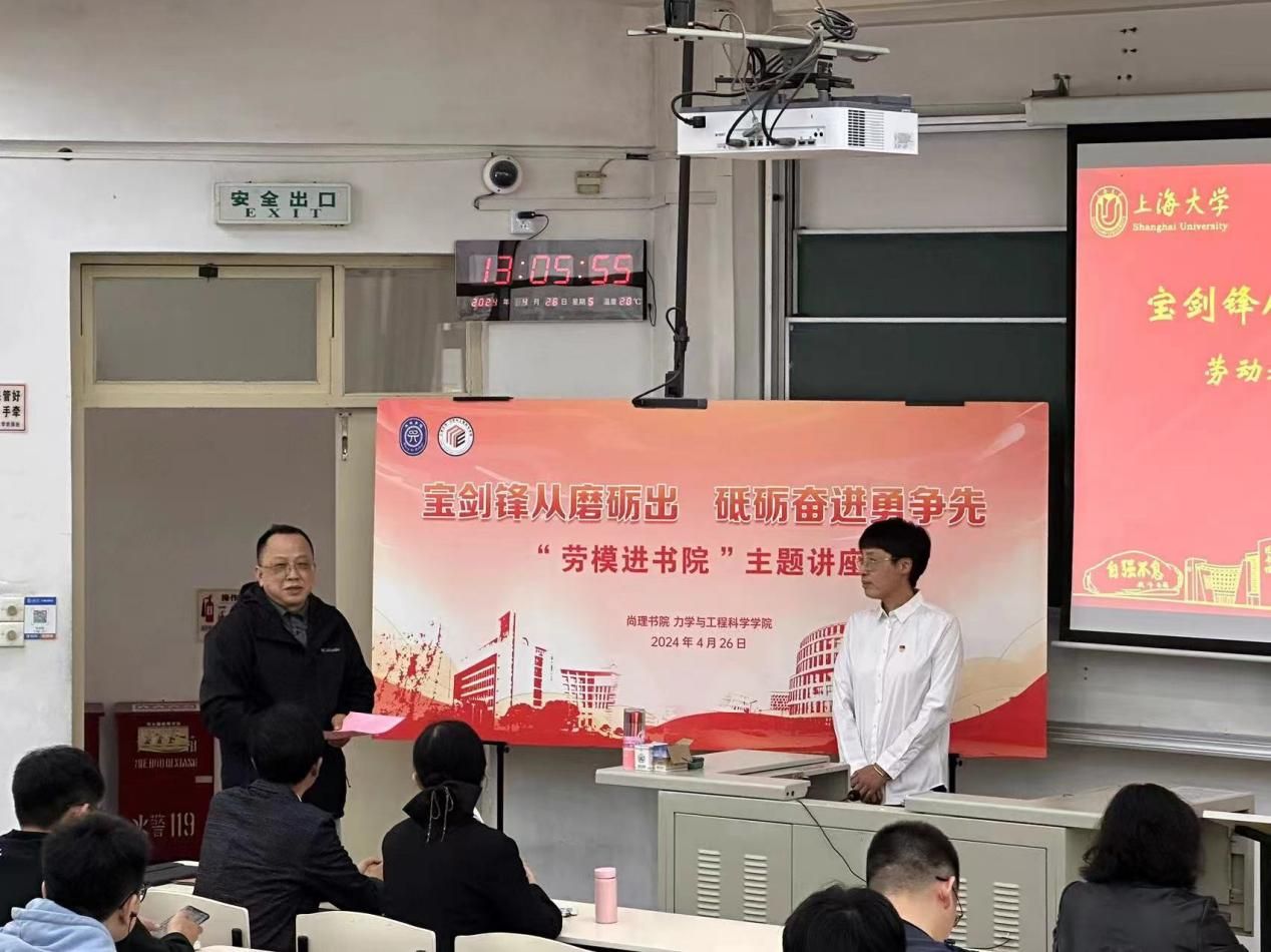 征途漫漫,劳不可缺。五一国际劳动节前夕,为全面学习贯彻党的二十大精神,将习近平总书记关于劳动精神的重要思想内化于心、外化于行,牢固树立劳动最光荣、劳动最崇高、劳动最伟大、劳动最美丽的观念,培养勤俭、奋斗、创新、奉献的劳动精神,4月26日下午尚理书院、力学与工程科学学院举办的“宝剑锋从磨砺出,砥砺奋进勇争先”劳模进书院暨廉洁文化教育专题报告于德赢ac米兰官方合作vwin宝山校区CJ207室举行。