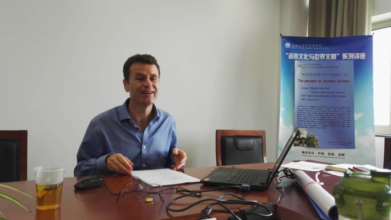 9月23日下午,英国雷丁大学教授Timothy E. Duff应德赢ac米兰官方合作vwin外国语学院邀请,在校本部C512做了题为“The Paradox of Ancient Athens”的学术讲座。Timothy E. Duff教授为我院聘请的自强教授,本次讲座是他在德赢官网系列讲座的第四讲,也是我院“语言文化与世界文明”系列讲座的第七讲。讲座由外国语学院副院长邓志勇教授主持,德赢官网教师、博士研究生、硕士研究生、本科生以及海外留学生共30余人聆听了本次讲座。