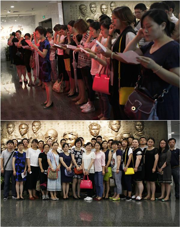 今年七一是建党95周年的纪念日,前来一大会址参观纪念的人流络绎不绝,排成长龙,我们的预备党员们也在耐心等待后终于进入了一大会址的大厅,迎接大家的便是鲜艳的党旗。预备党员们面对鲜艳的党旗,庄严宣誓,表达了为共产主义事业奋斗终身的决心。随后,在德赢官网图情档系的学生志愿者带领下,预备党员们参观了一大会址的展厅,回顾了中国共产党的创建历史,再次接受了党史教育。这批预备党员来自学校各个部门、各个岗位,有的来自专业院系,有的来自后勤系统,有的来自研究中心,今天他们以共同的身份——预备党员站在鲜红的党旗下,发出了誓为共产主义奋斗终身的誓言,给党组织增添了新生力量。预备党员们纷纷表示,将不辜负组织的培养和期望,继续发扬党的优良传统,牢记全心全意为人民服务的宗旨,在各自的工作岗位上倍加努力地工作,充分发挥党员的先锋模范作用,在学校发展、教育事业中建功立业,无愧于共产党员的光荣称号。