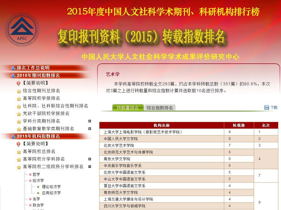 中国人民大学书报资料中心今年3月29日发布的2015年“复印报刊资料”转载统计,在艺术学门类高等院校二级院所分学科排名(转载量排名和综合指数排名)中,德赢ac米兰官方合作vwin上海电影学院在全国高等院校二级院所中排名第一。上海电影学院(原影视艺术技术学院)艺术学在这项排名上已连续五年蝉联第一。排名第二名至第五名的高校院所分别是中国人民大学文学院、北京大学艺术学院、北京师范大学艺术与传媒学院、南京大学文学院。