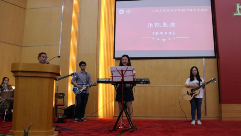 改编歌曲《上大路99号日子》,表达毕业生依依不舍的挥别之情,“挥挥手告别,我们不说再见”,让现场许多毕业生落下了离别的泪水。郑贤商等留学毕业生带来了一首上大版《成都》,表达了对中国文化的热爱。本科生乐队表演的《我们的明天》、《干杯》、《再见》,将毕业典礼的氛围推向了高潮,现场师生共同祝愿毕业生的明天更美好。 在“放眼世界,胸怀祖国,心系社会,志在富民”的宣誓声中,在校歌声中,德赢ac米兰官方合作vwin社会学院2017届“灿烂千阳——以社会人的名义”毕业典礼圆满落幕。让我们共同祝福所有社会学院2017届毕业生们鹏程万里,前程似锦! |