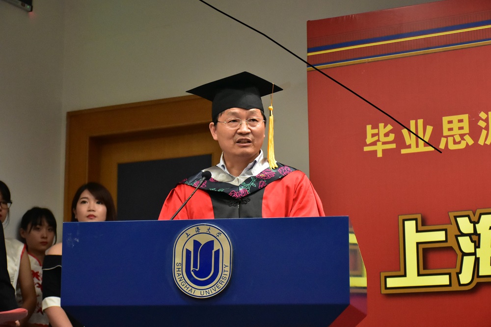 入场完毕,2016级本科生张洽闻、张卓君手执院旗、院徽入场,钱伟长学院院徽以钱伟长的首字母QWC进行变化,设计彰显了钱院学子自强不息的精神和学院追求卓越的理念。国歌奏唱完毕,钱伟长学院常务副院长张阿方教授进行了毕业致辞并介绍了2017届毕业生的培养情况。钱伟长学院2017届共有15名本科生顺利毕业。其中11名是材料基因组工程特色培养班学生,4名是本硕连读模式培养学生。大学四年,同学们在各类学科竞赛中取得了可喜的成绩。其中国际级10人次、国家级2人次、上海市级2人次;创新创业创意类获奖——校级2人次;文艺类获奖——省市级1人次;精神文明类获奖——市级1人次、校级2人次。全体毕业生中,其中国内读研9人次;出国读研3人次,另有1人次目前办理出国申请中;直接赴工作岗位就业2人次。张阿方教授在院长致辞中,希望同学们记住:一个成功者不会放弃,而一个放弃者永远不会成功!社会需要不浮躁、踏实进取、懂科学、有人文情怀的建设者!希望同学们坚守内心的圣洁,用我们所能及的力量,抵制社会不良现象。我们不需要哗众取宠和投机功利,我们需要扎扎实实地为社会作贡献。我们需要做一个有益于家庭、有益于社会、有益于人类的“好人”。他希望从国家试点学院走出去的每个学子时刻铭记德赢ac米兰官方合作vwin校训:“自强不息”,也希望大家能成为脚踏实地的坚守者,勿忘初心,勇攀科学的高峰,为自己的人生树立伟岸的丰碑,在优秀面前,永不言弃。