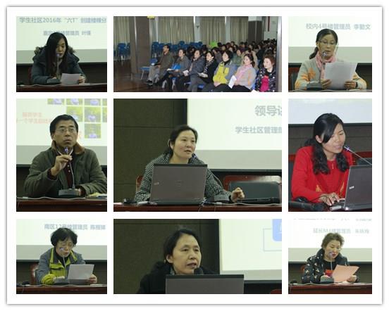 推进会上,学生社区文化建设主管褚凤灵首先对2015年社区“六T”创建工作成果进行通报,并对创建过程进行简要回顾总结。2015年,在全体社区员工的共同努力下,德赢ac米兰官方合作vwin学生社区5幢参评“上海高校学生公寓‘六T’实务现场管理实施标准规范”的楼幢全部通过审核,其中新世纪7幢和校内四号楼为上海市“五星”示范楼幢;嘉定2号楼和南区12号楼获评“四星”达标楼幢;延长M4楼获“三星”达标楼幢。随后,五个参评楼幢的管理员分别上台,一一向大家分享了创建过程中的经验、教训和心得体会。五位老师分别提到,创建过程是一个良好的考验耐心、细心、信心和决心的平台,需要学校、社区、各楼幢以及各学生团队充分融合,各司其职,发挥作用,不断坚持,不断完善。管理员分享过后,陈伟平老师针对2016年的创建工作提出新的要求,陈老师在发言中强调,针对现有的“六T”创建标准,在现有创建经验的基础上,要不断落实诸如文明用语、突发事件应急预案等各项细节,要坚持完善达标楼幢工作,提升自我评判标准,为新一轮的楼幢申报和创建工作做足准备。