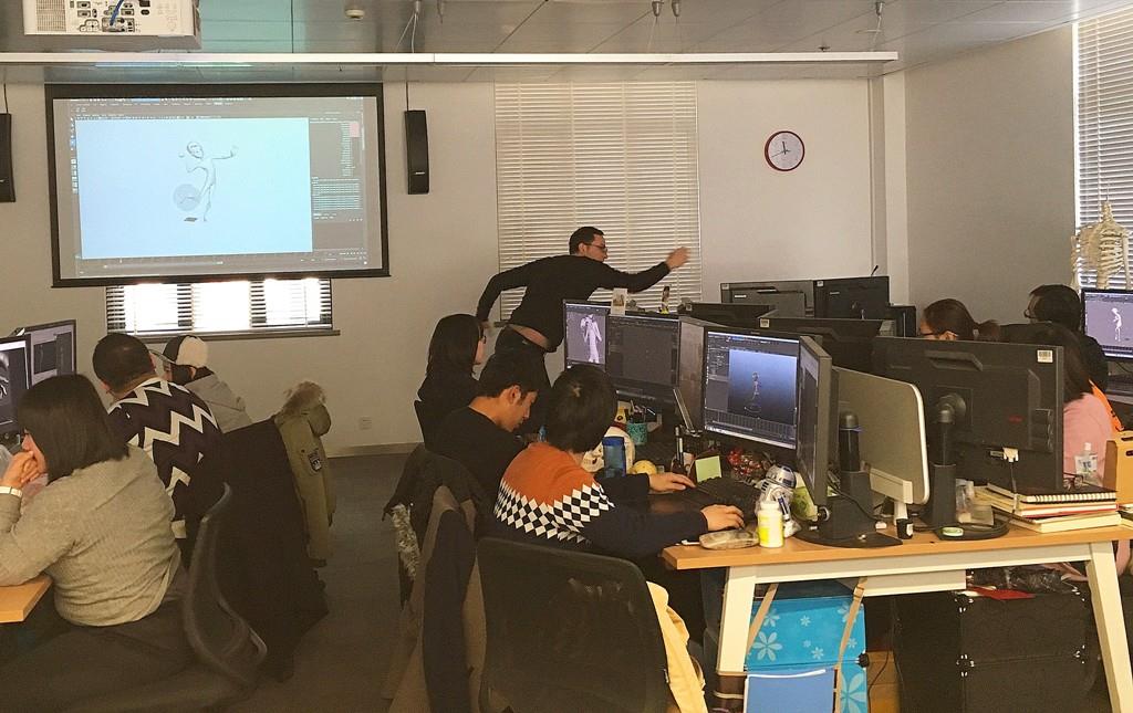 化妆课上,不少表演专业学生充当“志愿模特”,在外教贴身指导下,被同学们妆扮成了“光榔头”;3D课上,外教则身体力行、甘当模特,为电脑前的学生进行动画人物动作示范。按照其独特学制,猴年伊始的这一学期是他们的第三学期。这一届在校生共74名,包括应届入学学生、其他高校在读生以及社会工作人员等。