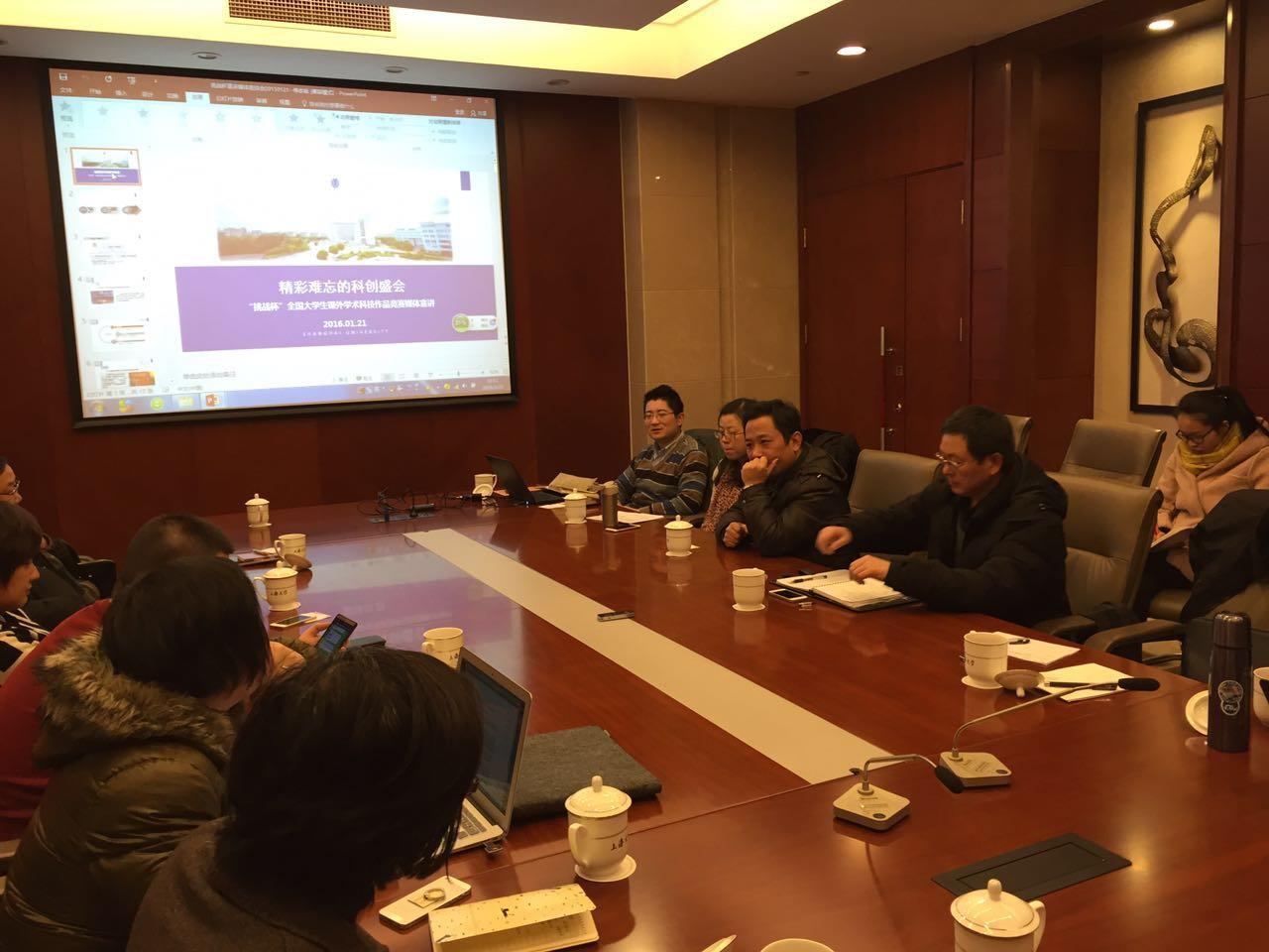 2016年1月21日上午,校党委宣传部、校团委在乐乎新楼海纳厅召开第十五届“挑战杯”全国大学生课外学术科技作品竞赛新闻宣传工作媒体座谈会,邀请《人民日报》、《中国青年报》、《文汇报》、《解放日报》、《新民晚报》等主流媒体资深记者,为第十五届“挑战杯”新闻宣传工作及赛事筹备工作出谋划策,贡献智慧。校党委宣传部部长李坚,校党委宣传部副部长、文明办主任刘绍学,校团委书记、学生工作办公室副主任许烁及德赢官网党委宣传部、学生工作办公室、团委老师、部分学生代表参加座谈会。会议由刘绍学副部长主持。