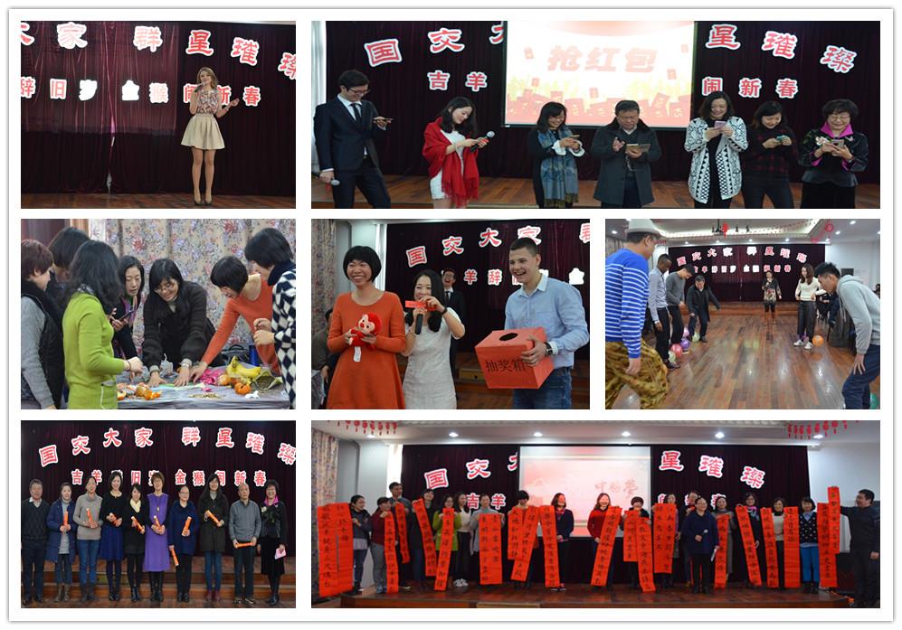 “国交大家 星光璀璨“迎新年会已成为全院教工期盼的盛会。其宗旨是:辞旧迎新送吉祥,身边榜样大家仿;展示才艺显精神,凝心聚力为发展。虽然羊年春节前才举办了第一届年会,但因代表了全体师生的意愿:迎吉祥、树正气、谋发展,所以已成为大家一年一度期盼的盛会。今年的年会于2016年1月8日上午举行。国交各部门的教职工及留学生朋友们近100人参加了本次年会。