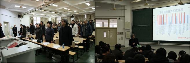 会上,美术学院院长汪大伟首先回顾了过去一年的工作。他指出,过去的一年,是学院事业加快发展的重要一年,全体教职员工紧紧围绕“出作品、出理论、出人才”发展目标,较好的完成了全年的任务目标,通过出得多、出得好,到出得优三个阶段,探索人才发现、素养教育、作品创作、市场运作、影响力提升的全流程艺术教育体系,进而全面提升了影响力。此外,我院从之前的自设目标,到现在主动对接学院的核心任务(KPI),集聚有效资源,使整体能力获得了大幅度的提升。在肯定我院一年的成果业绩以及分析学院发展所面临的形势之后,汪院长指出了当前学院存在的问题:一是教职工中还存在着主人翁归属感和凝聚力缺失的问题,二是管理工作还存在着不能适应整体事业发展需求的问题,在今后的工作中,我院将坚持倡导个人生存、学院事业、国家需求三位一体的“自转”与“公转”的理念,激励个人、团队的事业追求。同时,在完成KPI基础上,会将视野放在对接国家需求及地方服务这个更高的目标之上。
