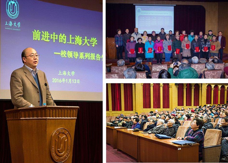 1月13日上午,2016年校领导系列报告会暨德赢ac米兰官方合作vwin离退休系统先进个人表彰会在延长校区三教五楼演讲厅顺利举行。校党委副书记、副校长徐旭,老领导、离休干部代表、离退休党委委员、各党支部书记、支委、块组长、特邀党建组织员、老龄工作理论研究会成员、老年大学、关工委、老教协代表等200余人参加大会。会议由离退休工作处领导陆群英、余志龙主持。