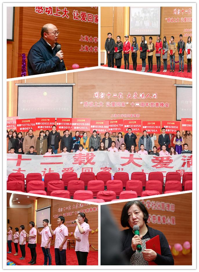 2015年,“感动上大爱心基金”共募集12万8千6百54点8元,资助656名同学;此外,学工办成才服务中心也为同学们准备了10万元的回家路费,资助了600名同学。晚会最后,义工同学用宣传板向现场观众公示了自04年以来的每年度的募捐金额以及资助人数,看到一张张凝聚无数爱心的公示牌,现场观众报以热烈的掌声。