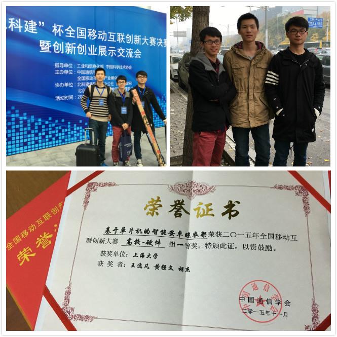 大赛实际参赛作品151项,其中高校组99项,社会组52项,经过评委评审,最终结果如下:特等奖:2项、一等奖:13(高校)+ 8(社会)=21项、二等奖:26(高校)+ 17(社会)=43项、三等奖:59(高校)+ 26(社会)=85项,其中德赢官网通信与信息工程学院参赛作品“基于单片机的智能安卓晾衣架”(翔英学院2013级本科生王逸凡、黄强文、胡杰),获得“全国总决赛高校硬件组一等奖”。
