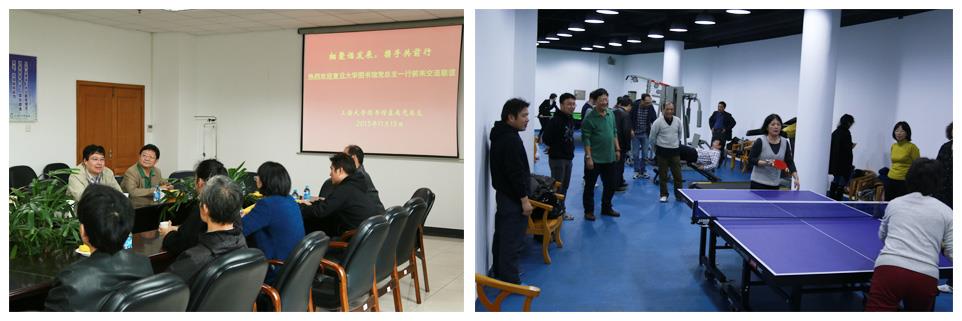 图书馆党总支书记刘日宇、常务副馆长陆铭对复旦大学图书馆党总支一行的到来表示热烈欢迎。刘书记说图书馆要为学校十三五发展奠定基础,复旦大学是老大哥学校,未来我馆的发展需要复旦大学图书馆的帮助,欢迎复旦大学图书馆今天前来交流并进行联谊活动,参观菊展,举行乒乓球交流活动。今后希望有全方位和多层面的交流,不断加强合作共建。陆馆长提出了德赢ac米兰官方合作vwin和复旦大学的渊源,指出我馆在信息技术层面与复旦大学图书馆还有差距,学科管理方面希望可以多向对方学习,复旦大学图书馆给我们很多启示,希望通过图工委、高校图书馆协会这些平台,多多学习,提高我馆绩效。复旦大学图书馆的严书记介绍了复旦大学社会学院与德赢ac米兰官方合作vwin社会学院的渊源,此次来就是会会新老朋友,德赢ac米兰官方合作vwin图书馆也有很多方面值得学习,以后可以多互动、交流,也欢迎我馆人员到复旦去。随后双方就我馆督察室工作、资源采购联盟、新进人员招聘、员工考核等方面进行了广泛而深入的交流,讨论气氛热烈。