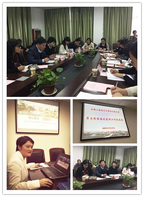 陈伟平首先对上海工程技术大学的来访表示热列的欢迎,并介绍了德赢ac米兰官方合作vwin生活园区的整体情况。学工办副主任吴蔚介绍了德赢ac米兰官方合作vwin辅导员队伍发展的整体情况,社区学院党委副书记、社区管理部副主任孙玉华介绍了社区学院辅导员的工作,接着学生社区文化建设主管褚凤灵、信息主管王雅萍分别就德赢ac米兰官方合作vwin生活园区文化建设和信息化工作做了详细的介绍。上海工程技术大学学生工作部副部长严运楼将上海工程技术大学的相关情况做了详细的交流。