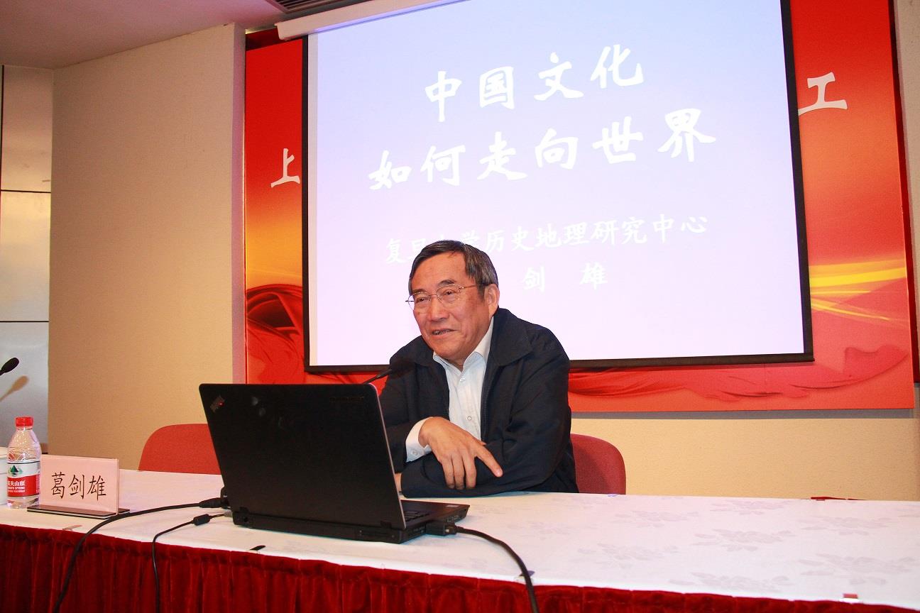 对于当今关于文化的不同定义,葛剑雄引用了恩格斯《在马克思墓前的讲话》“马克思发现了人类历史的发展规律,即历来为繁茂芜杂的意识形态所掩盖着的一个简单事实:人们首先必须吃、喝、住、穿,然后才能从事政治、科学、艺术、宗教等等。”随后,他论述了什么是中国文化、中国文化的特点、中国文化在历史上的地位、中国文化为什么要走向世界以及如何走向世界、中国文化在未来世界的地位。葛剑雄认为,中国文化要走出去,就要坚持一个态度——在怀有自信的同时要懂得理解、欣赏、学习其他民族文化,相互借鉴,求同存异,实现包容发展。他认为“文化发展总体与经济发展同步,在局部时间或阶段会出现落后于经济发展的状况,中国目前就处于文化落后于经济的窘境,所以决不能走西方老路,搞什么文化侵略和文化霸权”。葛剑雄最后强调,文化未来发展趋势就如费孝通先生所说:“各美其美,美人之美,美美与共,天下大同。”