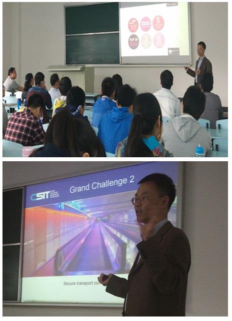 首先,周博士为大家介绍了贝尔法斯特女王大学的基本情况,它创办于1845年,学校环境宜人,建筑古色古香。这所学校是有着英国常春藤联盟之称的“罗素大学集团”成员之一。在完全大学指南的学科专业排名上,贝尔法斯特女王大学的工程学科一直稳居全英Top20。接着周博士简单介绍了自己所在的电子电气与计算机工程专业的历史和取得的佳绩,并且详细讲述了女王大学与我国大学合作的方式和内容,介绍了论文的一般发文流程和审稿过程,并鼓励同学们申请前往该大学进行学术交流。随后,周博士围绕视频监控、性别识别、年龄识别和人体跟踪等诸多领域就安全问题进行了深入的研究和探讨,并为大家播放了一个视频,讲述人工智能系统在发生异常事件中的应用,同学们受益匪浅。