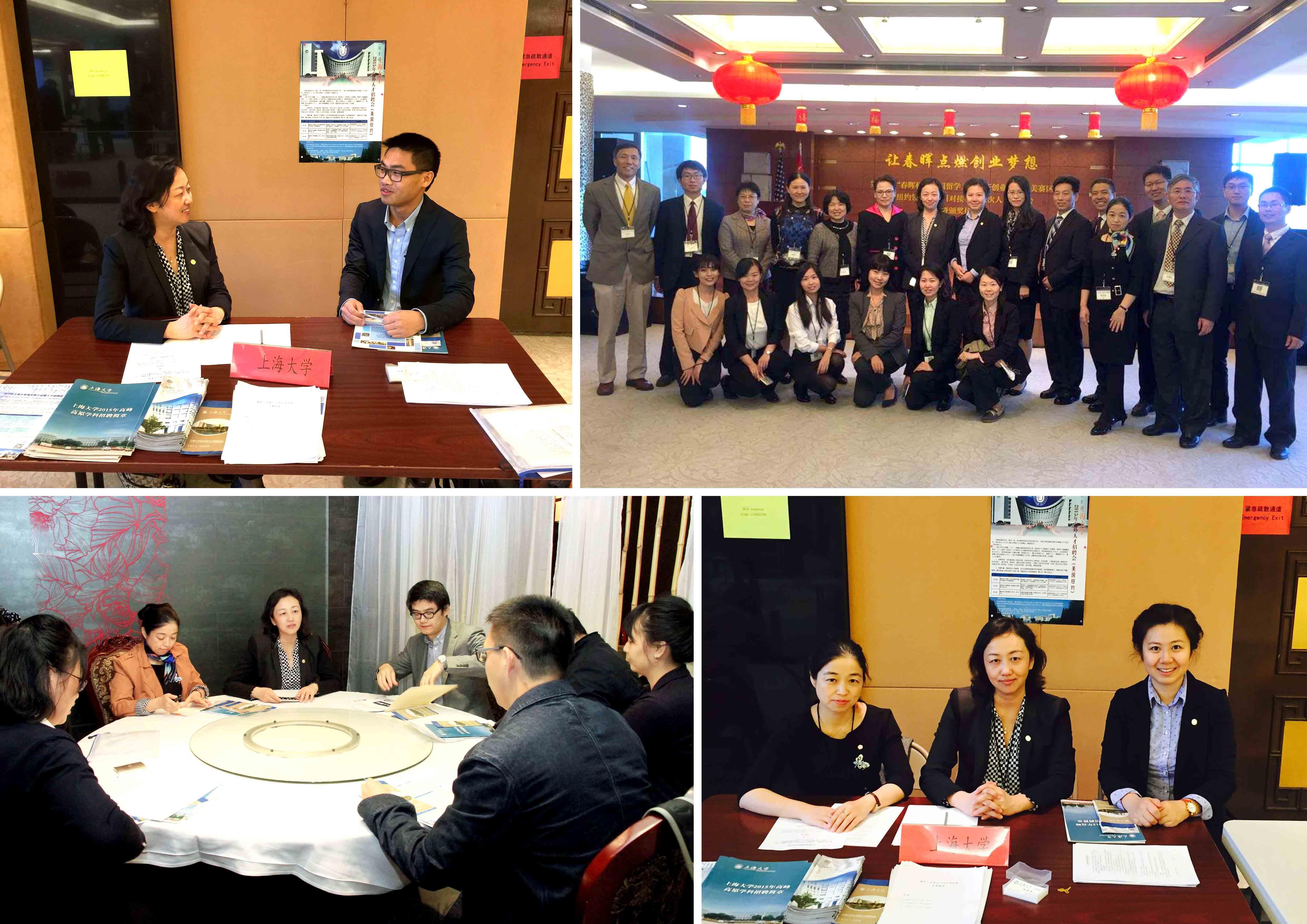 2015年10月22日至24日期间,德赢官网党委常委、悉尼工商学院院长兼上海温哥华电影学院院长龚思怡教授以及学校人事处副处长张英姿、国际事务处刘伊科长一行赴纽约参加了由《神州学人》杂志社与北美华人科技工商联合会联合举办的“春晖杯”大赛人才招聘项目对接暨招待会、纽约地区小规模专家学者沙龙以及海外留学人员创业发展求职交流洽谈会等一系列人才招聘会。教育部留学服务中心程家财主任、教育部国际合作与交流司徐培祥处长出席招待会并讲话,国内主要由上海市人社局、德赢ac米兰官方合作vwin、东华大学、西安交通大学等二十多家单位参展,地点设在中国驻纽约总领馆,参加人数约400余人。