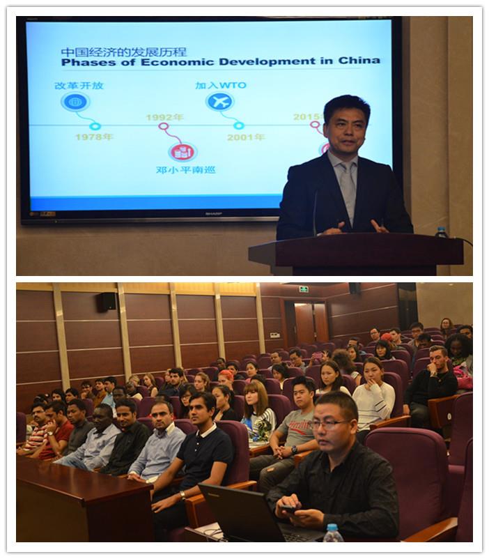 接着,毛雁冰副教授为留学生做了题为“中国经济的发展历程和新的选择”的讲座,他用中英双语,结合详实的数据向留学生介绍了中国对外经济发展的历史和现状,对中国经济“新常态”、“一带一路”等概念做了深度阐释。留学生对此饶有兴趣,在讲座后与毛老师进行了深入互动。此次讲座是我院面向留学生举办的“知华讲堂”系列活动的第15讲,对于留学生新生了解中国国情、尽快适应校园生活大有裨益。