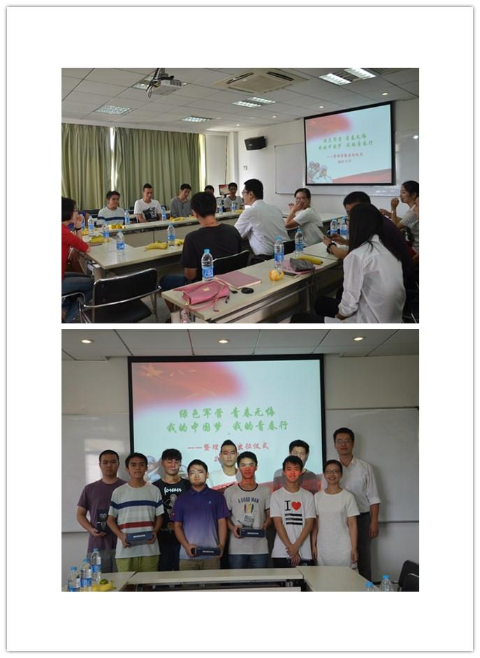 会后,两位书记把学院精心准备的礼品向同学们做了派发,并合影留念,希望他们能够在未来的日子里做一名合格的大学生兵,为国家的建设作出更大的贡献。